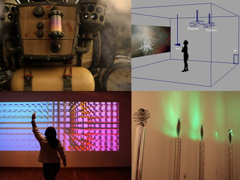 互動裝置藝術方面,其實蠻像虛擬實境遊戲的概念。利用投影機投射影像,再使用攝像頭、電子捕捉人類動作等裝置,讓人做了某個動作後,投射影像產生變化。也有踩踏碰觸圖案產生聲音的作品,非常能吸引觀者的參與,不過大多形式重於內容,需要更進一步的設計,才能帶給觀者更多感動。
